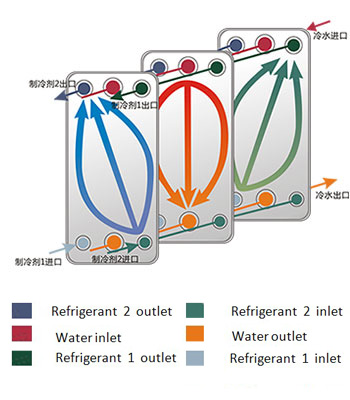 Water and refrigerant lines at both sides of the heat exchanger, to facilitate the installation of pipes and connections. two diagonal flow design of refrigerant side ensures that even if only one in the cooling system, can still provide a high efficiency cross-flow, the most effective use of heat transfer surfaces, ensure the thermal load is balanced between the loops.